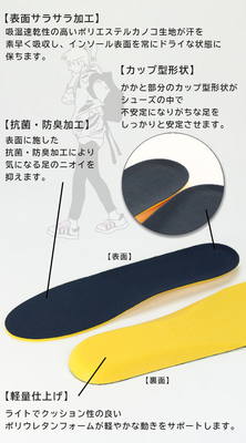 吸湿速乾性の高いポリエステルカノコ生地が汗を素早く吸収し、インソール表面を常にドライな状態に保ちます。