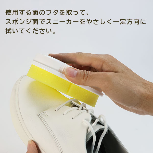 ◯使用する面のフタを取って、スポンジ面でスニーカーをやさしく一定方向に拭いてください。